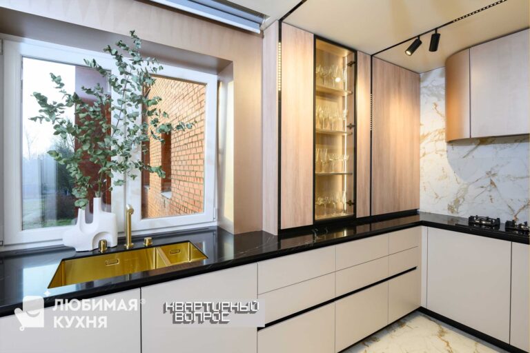фасады ТРП Монолит беж, фреза Модерн, алюминиевая рамка Золото, стекло Тренд Вирджиния